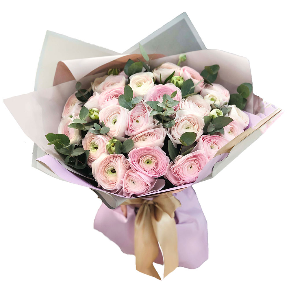 Ранункулюс (лютик), эвкалипт. Упаковка (лента, пленка, крафт, сетка, пленка матовая)