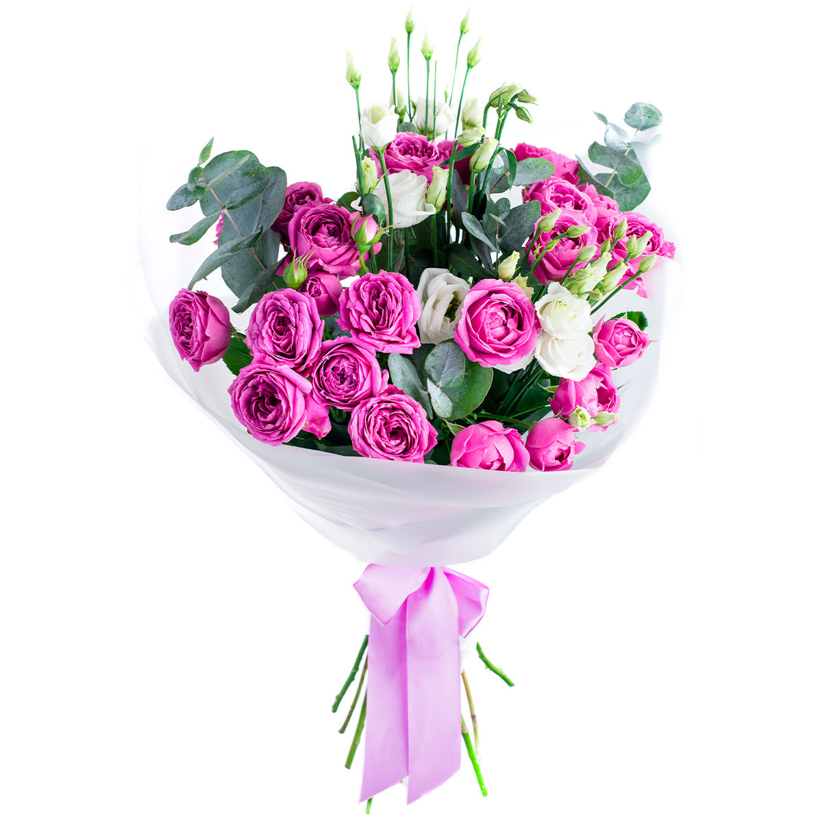 Роза кустовая розовая, эустома белая, эвкалипт. Упаковка (лента, пленка, крафт, сетка, пленка матовая)