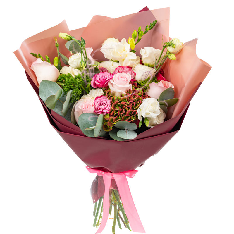 Гортензия зелено-красная, эустома белая, роза одноголовая розовая, роза кустовая розовая, эвкалипт, зелень. Упаковка (лента, пленка, крафт, сетка, пленка матовая)