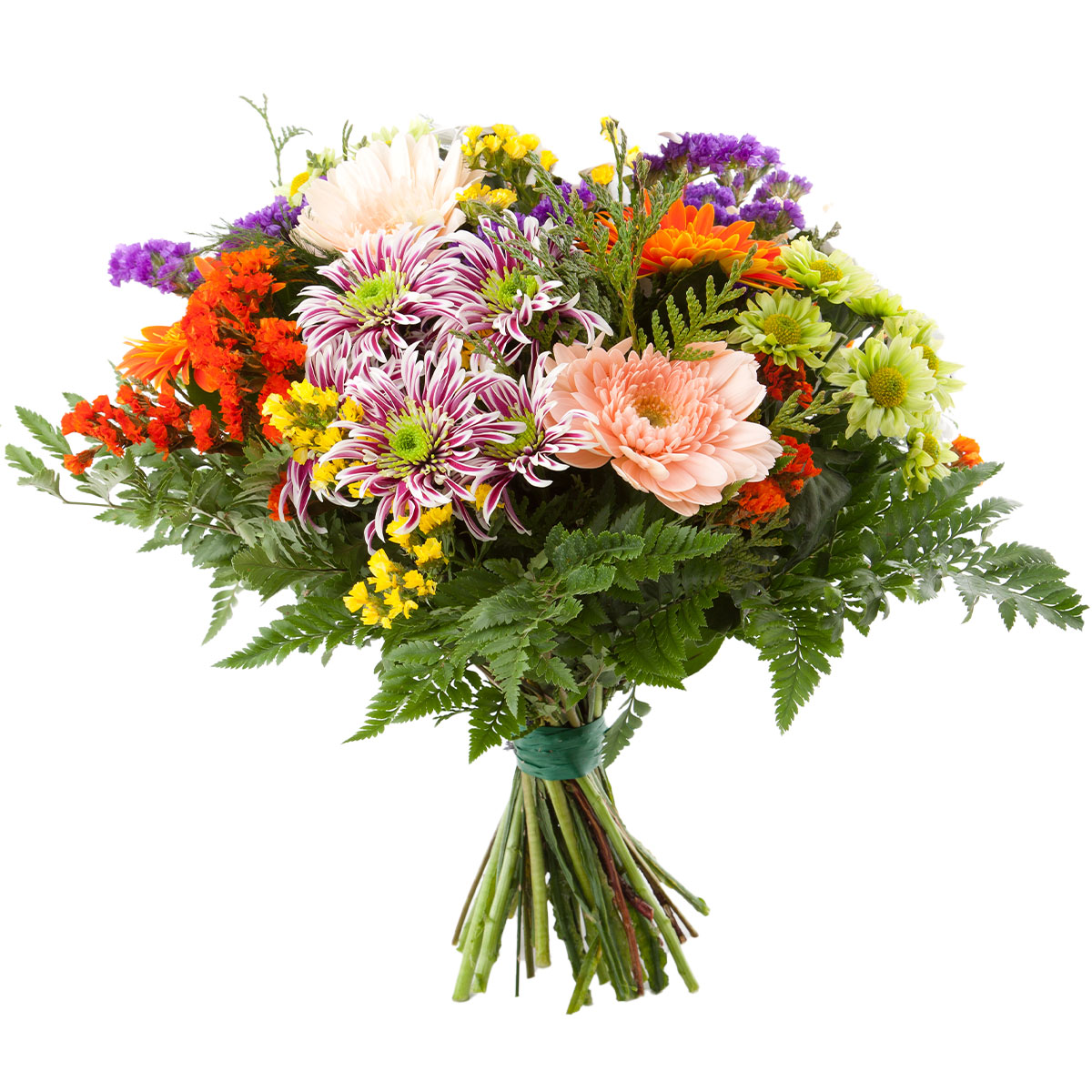 Гербера кремовая, хризантема мексикано, хризантема кустовая зеленая, статица оранжевая и фиолетовая, зелень. Упаковка (лента, пленка, крафт, сетка, пленка матовая)