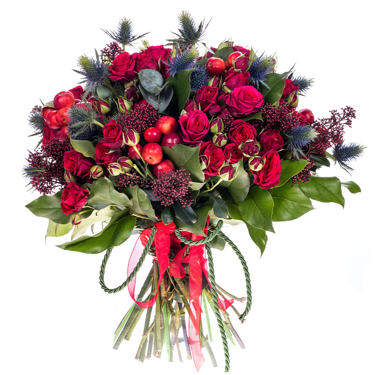 Роза кустовая красная, эрингиум, гиперикум, озотамнус, эвкалипт. Упаковка (лента, пленка, крафт, сетка, пленка матовая)
