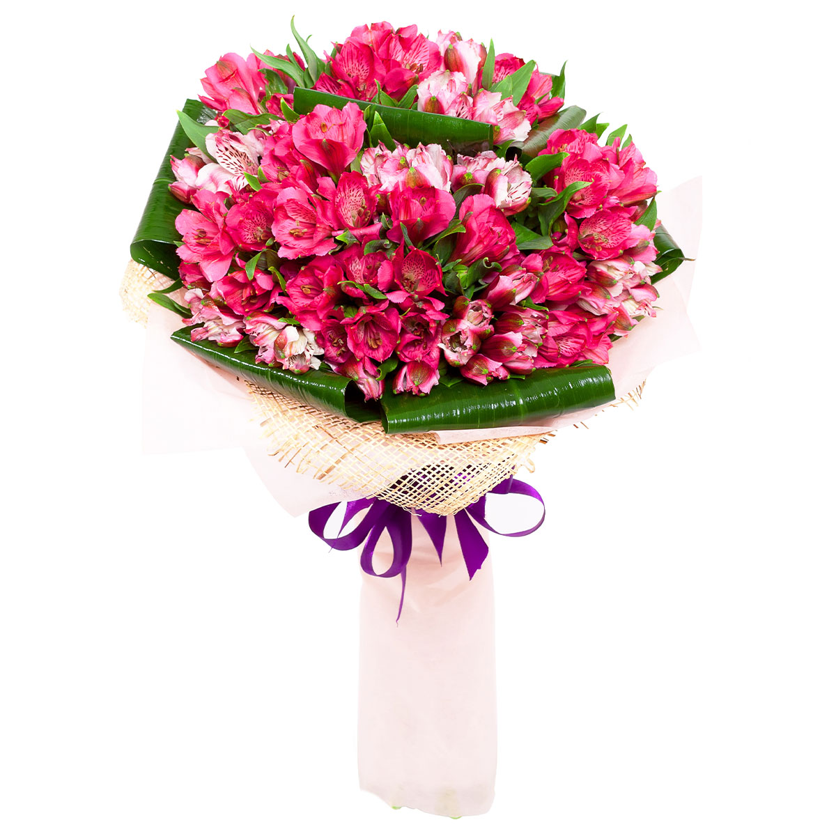 Альстромерия розовая, аспидистра. Упаковка (лента, пленка, крафт, сетка, пленка матовая)