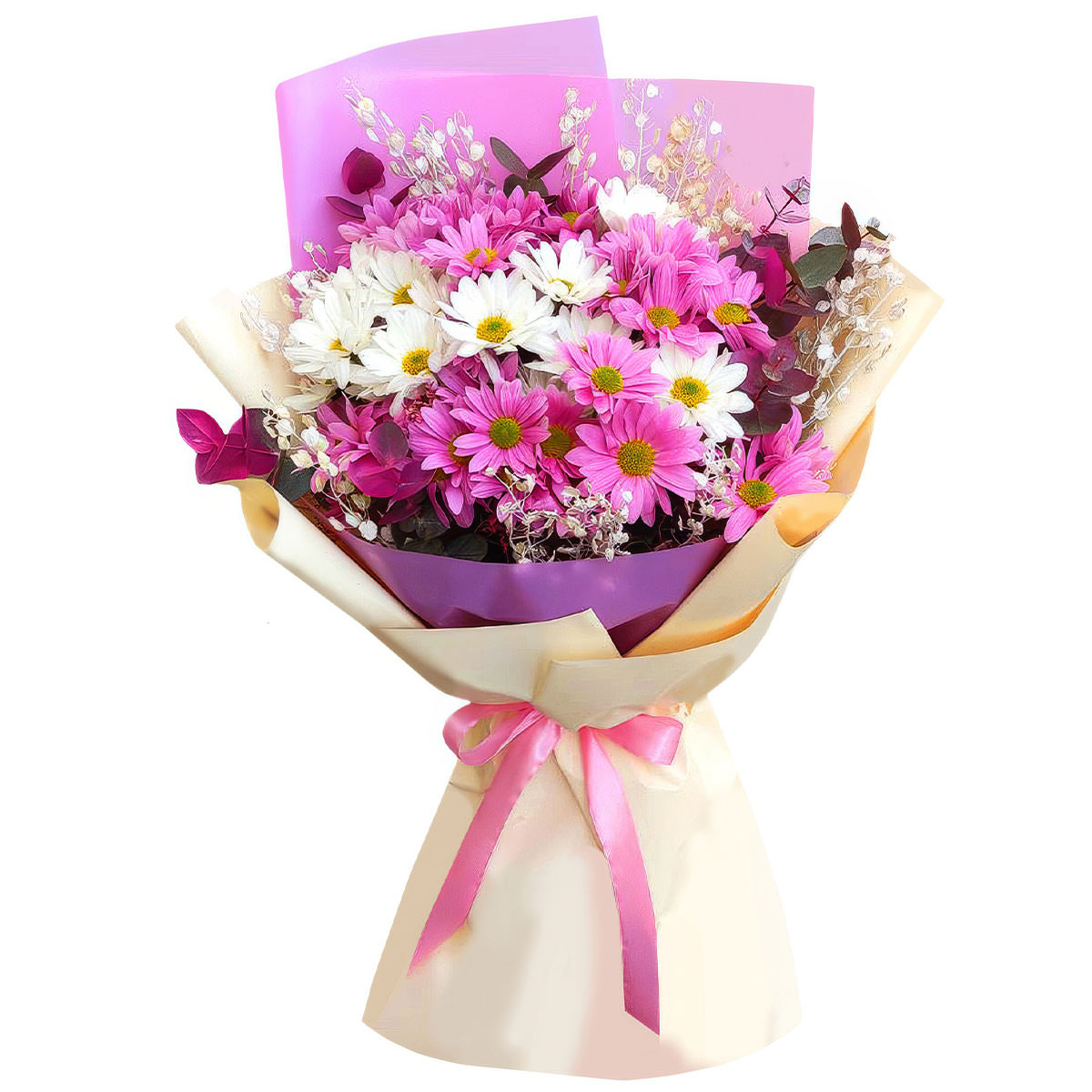 Хризантема кустовая розовая и белая, эвкалипт, лунария. Упаковка (лента, пленка, крафт, сетка, пленка матовая)