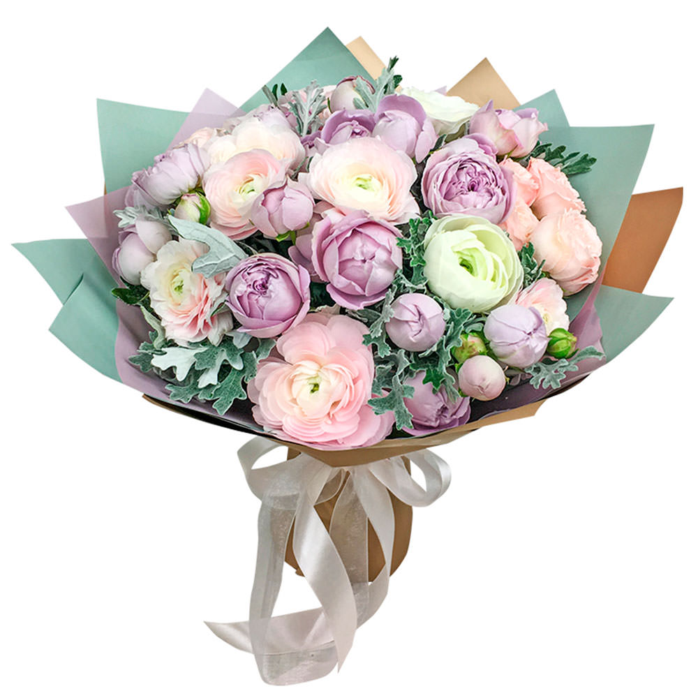 Роза пионовидная кустовая сиреневая, ранункулюс розовый, зелень. Упаковка (лента, пленка, крафт, сетка, пленка матовая)