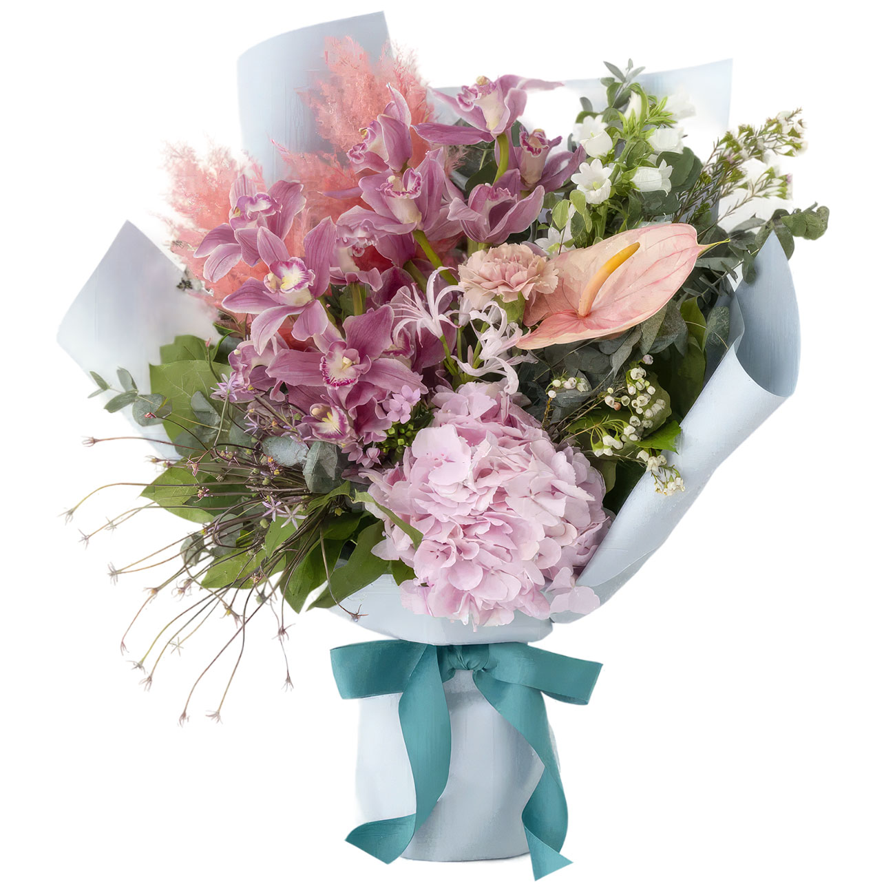 Орхидея розовая голландская, антуриум розовый, гортензия розовая голландская, белый колокольчик, сухоцвет розовый. Упаковка (лента, пленка, крафт, сетка, пленка матовая)