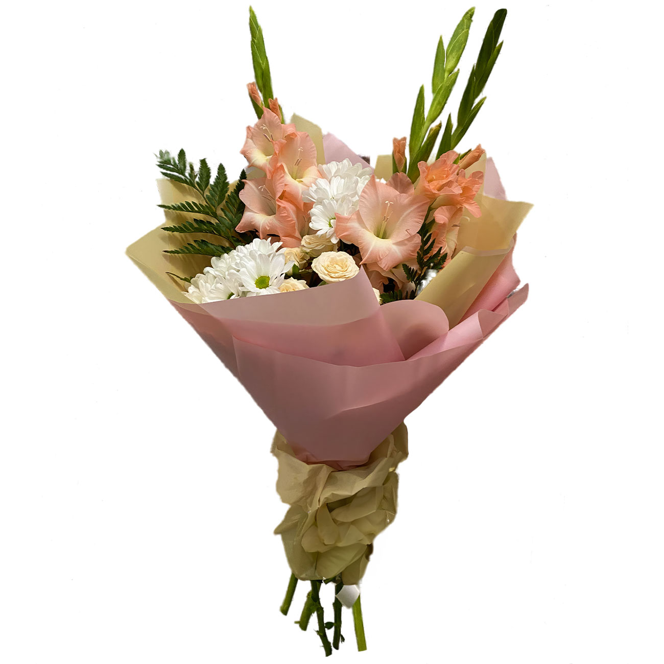 Гладиолус персиковый, хризантема кустовая белая, роза кустовая кремовая, зелень. Упаковка (лента, пленка, крафт, сетка, пленка матовая)