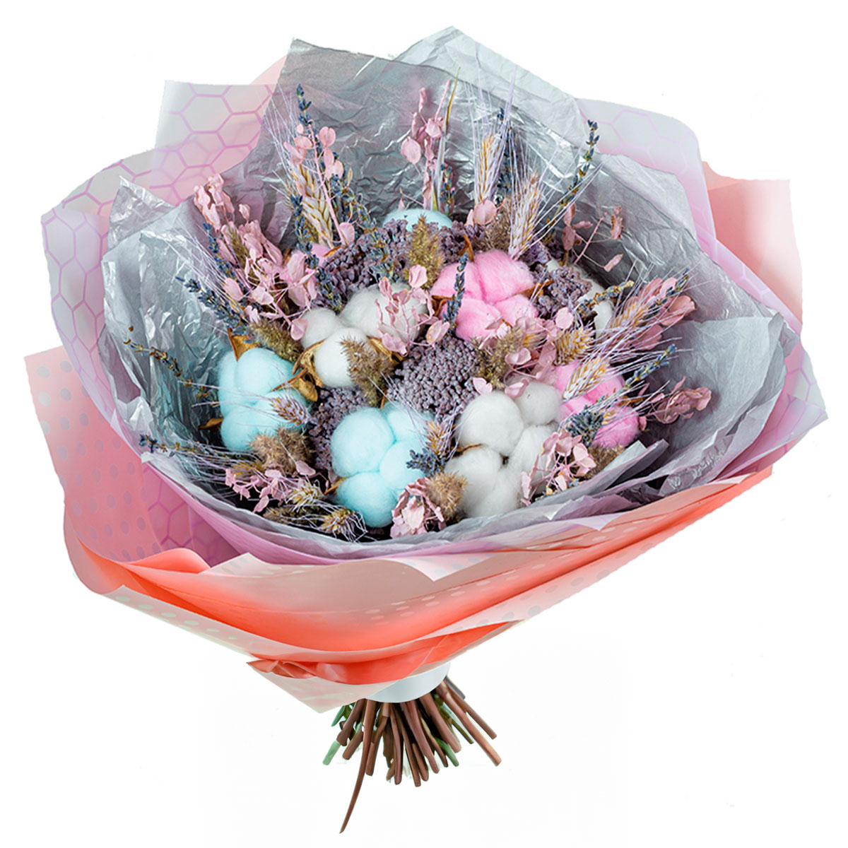 Хлопок, лаванда, пшеница, пижма. Упаковка (лента, пленка, крафт, сетка, пленка матовая)