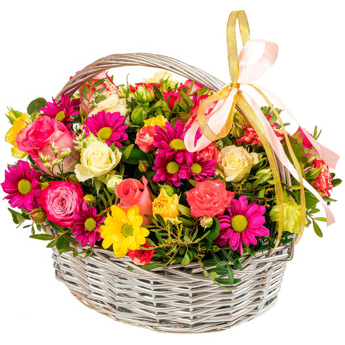 Роза одноголовая розовая, роза кустовая микс (белая, желтая), хризантема кустовая микс (розовая, желтая), фисташка. Упаковка (Корзина, оазис).