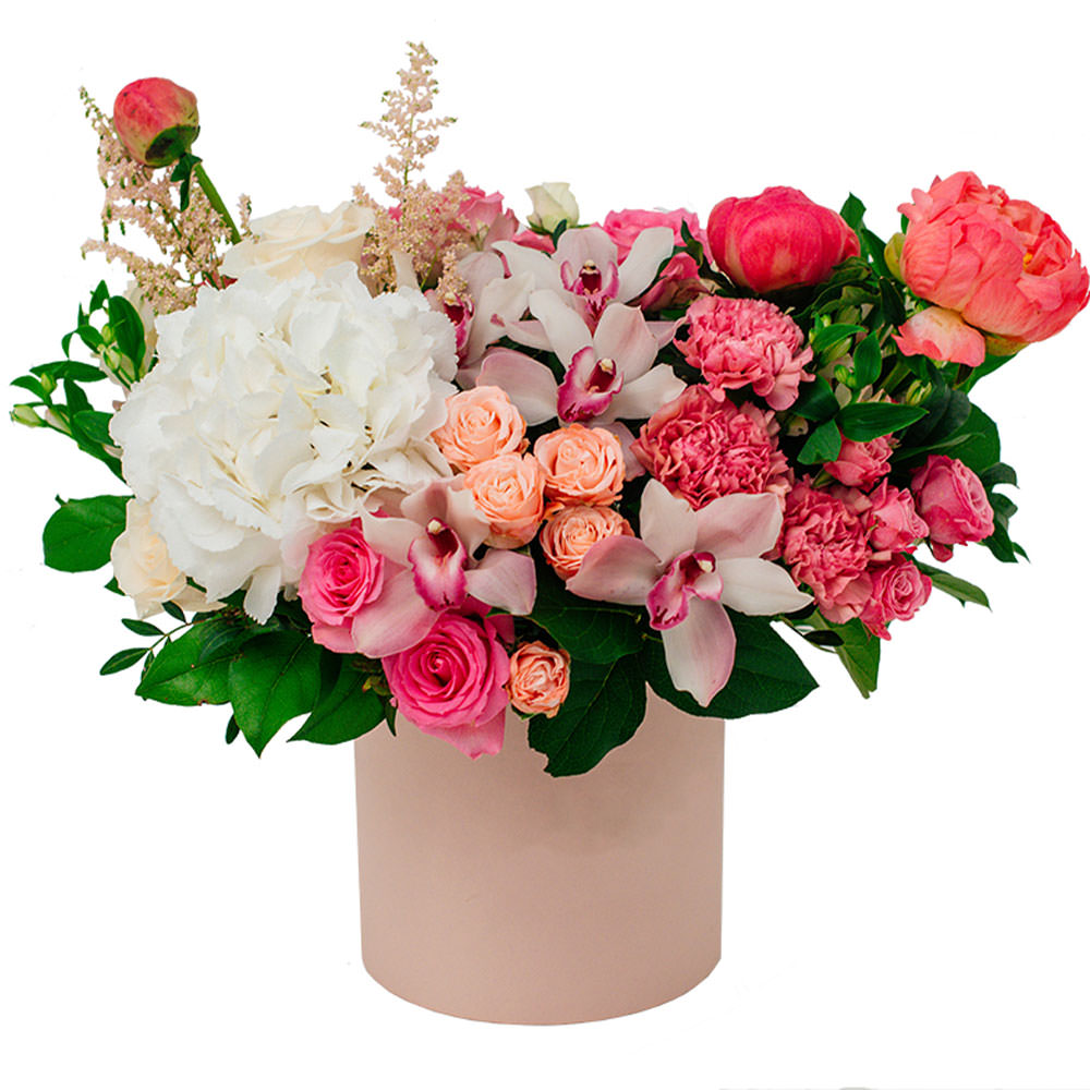 Гортензия белая, роза кустовая микс (кремовая, розовая), роза одноголовая розовая, гвоздика розовая, пион коралловый, орхидея розовая, эулалия. Упаковка (шляпная коробка, квадратный бокс, коробка сердце, оазис)