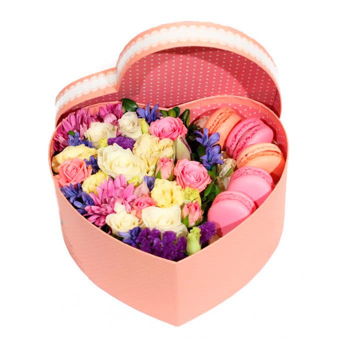 Роза кустовая микс (кремовая, розовая), хризантема кустовая сиреневая, статица, макарунс. Упаковка (шляпная коробка, квадратный бокс, коробка сердце, оазис)