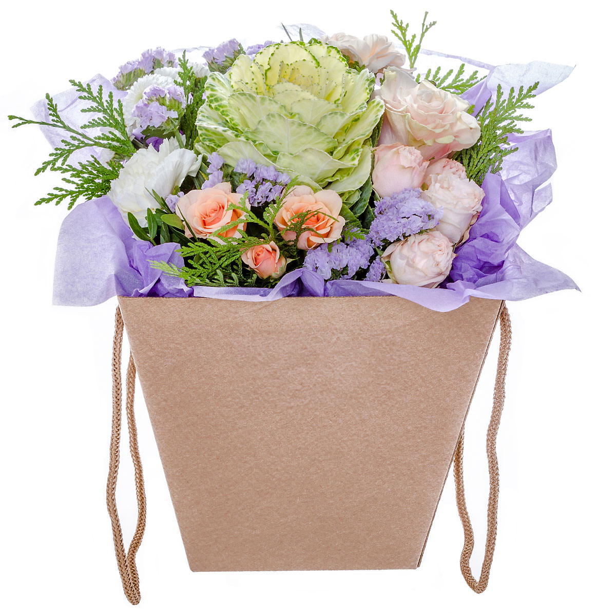 Декоративная капуста, роза кустовая персиковая, роза пионовидная розовая, гвоздика белая, статица сиреневая, туя. Упаковка (шляпная коробка, квадратный бокс, коробка сердце, оазис)