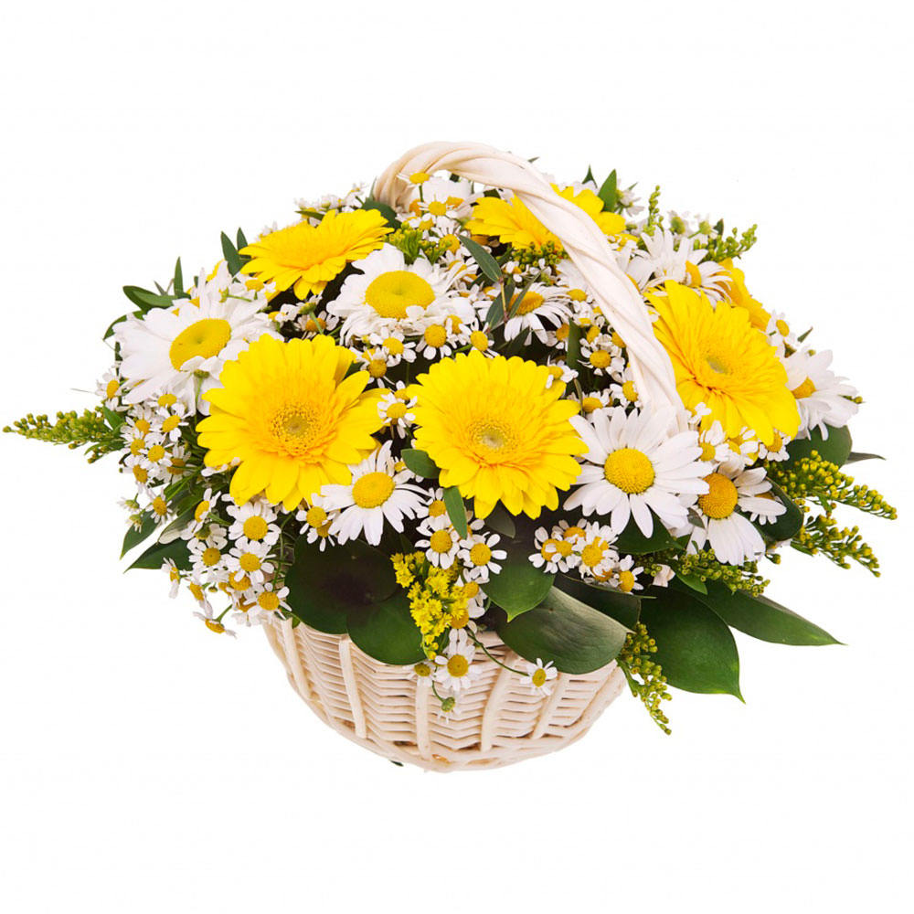 Гербера желтая, ромашка, солидага. Упаковка (Корзина, оазис).