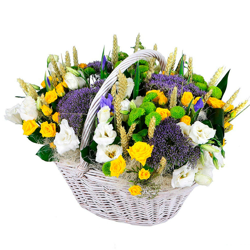 Трахелиум, хризантема кустовая зеленая, роза кустовая желтая, эустома белая, колосья, аспидистра. Упаковка (Корзина, оазис).
