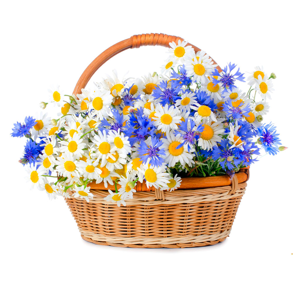 Ромашка, васильки. Упаковка (Корзина, оазис).